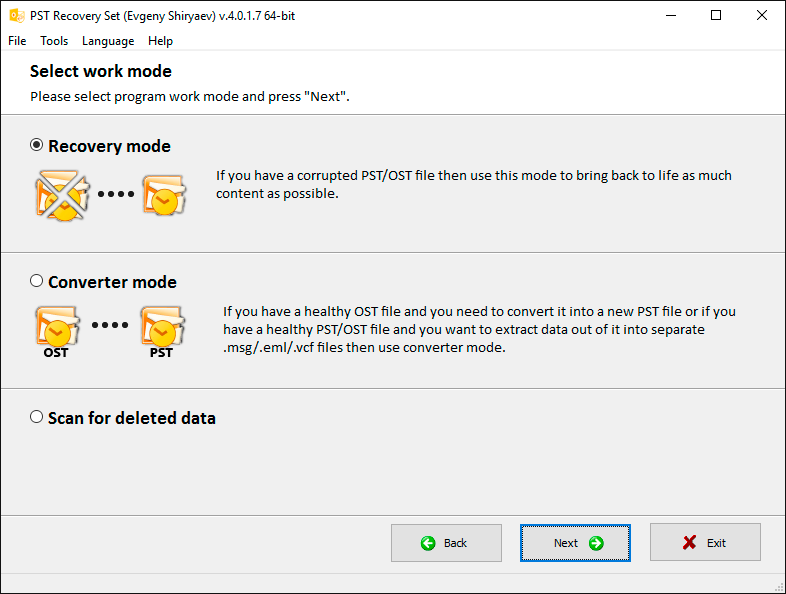 • Recovery Mode – use it if you need to repair a damaged *.pst or *.ost file.